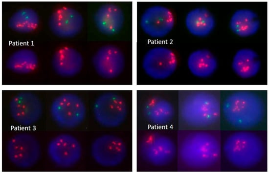 We collected data from 89 pediatric patients diagnosed with ALL at our institution from 27 June 2013 to 21 December 2023, who were included in the “LAL/SEHOP-PETEHEMA 2013” registry. Median age at diagnosis was 7 years (range 1 to 16). Four patients (1 male and 3 females) were classified as iAMP21-positive ALL according FISH analysis (Figure 1), and 85 were classified as non-iAMP21 patients. Table 2 includes clinical characteristics of patients at primary diagnosis, NCI risk stratification, and initial risk-group assignment according to the “LAL/SEHOP-PETHEMA 2013” protocol.