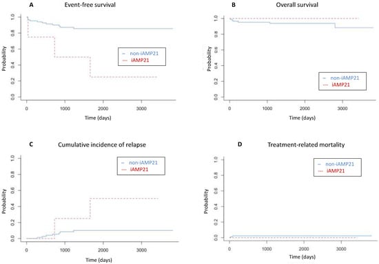 (A) Five-year event-free survival (25% vs. 85.6%; p = 0.001), (B) overall survival (100% vs. 93.7%; p = 0.6), (C) cumulative incidence of relapse (50% vs. 9.9%; p = 0.02), and (D) treatment-related mortality (0% vs. 2.38%; p = 0.76) among patients with iAMP21-positive (red lines) and non-iAMP21 (blue lines) acute lymphoblastic leukemia.