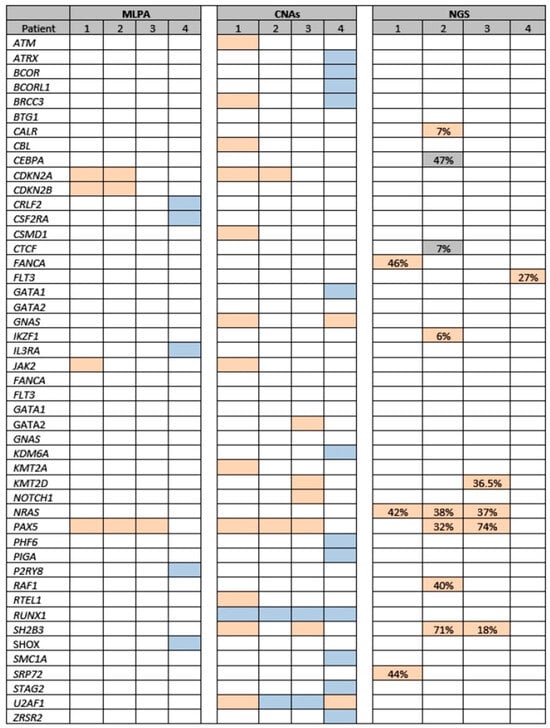 Genetic alterations in four patients with iAMP21-positive ALL (affected genes are presented in alphabetical order). MLPA: Salmon color, heterozygous deletion; blue, heterozygous duplication. CNAs: Salmon color: copy number < 2 (deletion/loss); blue color: copy number > 2 (amplification). NGS (gene variants): Salmon color, pathogenic or likely pathogenic variants (% VAF); grey, uncertain significance variant (% VAF). Abbreviations; ALL, acute lymphoblastic leukemia; CNAs, copy number alterations; MLPA, multiple ligation probe assay, NGS, next-generation sequencing; VAF, variant allelic frequency.