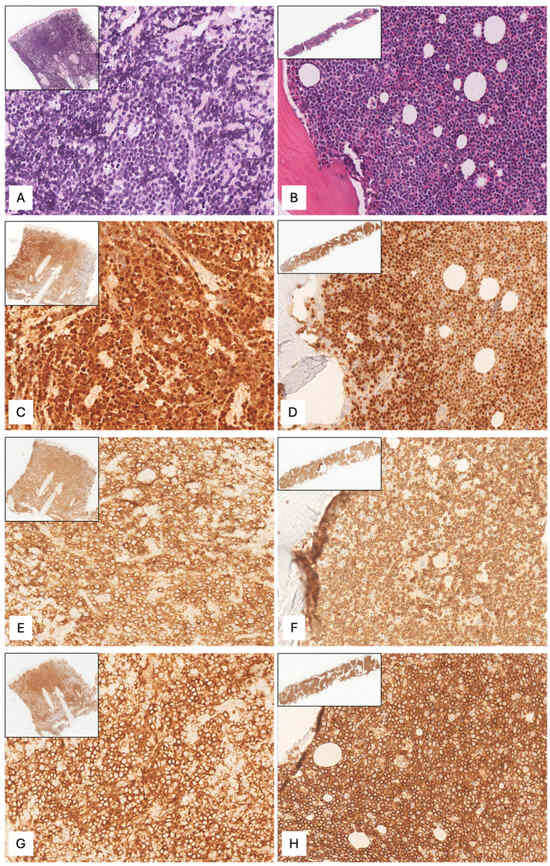 Cutaneous ((A), hematoxylin–eosin (H&E), original magnification (o.m.) x300, upper insert o.m.x23) and bone marrow biopsy ((B), H&E, o.m.x200, upper insert o.m.x10) showing diffuse infiltration by medium-sized cells with scant cytoplasm and round nuclei with condensed chromatin and indistinct nucleoli. The neoplastic cells were positive for TdT ((C), o.m.x300, upper insert o.m.x23) ((D), o.m.x200, upper insert o.m.x10), CD3 ((E), o.m.x300, upper insert o.m.x23) ((F), o.m.x200, upper insert o.m.x10), and CD8 ((G), o.m.x300, upper insert o.m.x23) ((H), o.m.x200, upper insert o.m.x10).