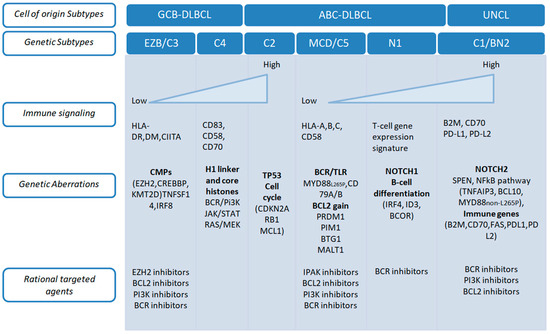 - Reddy, A.; Zhang, J.; Davis, N.S.; Moffitt, A.B.; Love, C.L.; Waldrop, A. Genetic and Functional Drivers of Diffuse Large B Cell Lymphoma. Cell 2017, 171, 481–494. [Google Scholar] [CrossRef] [PubMed]
