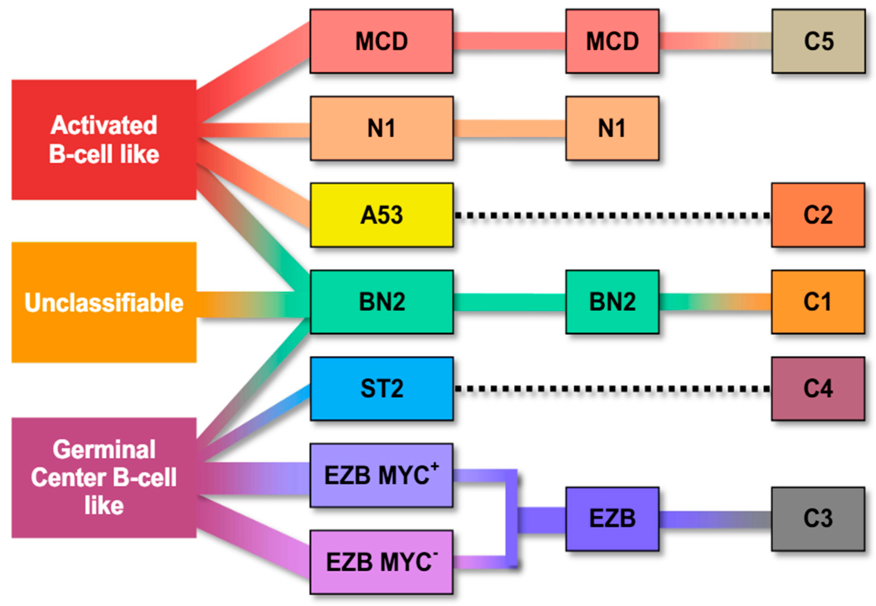- Ennishi, D.; Hsi, E.D.; Steidl, C.; Scott, D.W. Toward a New Molecular Taxonomy of Diffuse Large B-cell Lymphoma. Cancer Discov. 2020, 10, 1267–1281. [Google Scholar] [CrossRef]