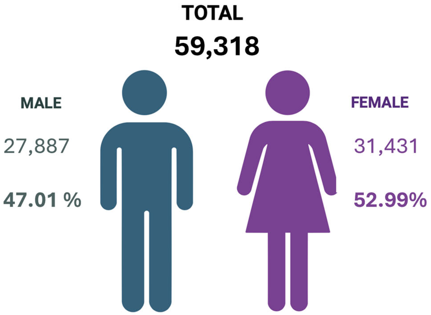 | Female | 1292 (4.11%) | 30,139 (95.89%) | 31,431 (52.99%) |