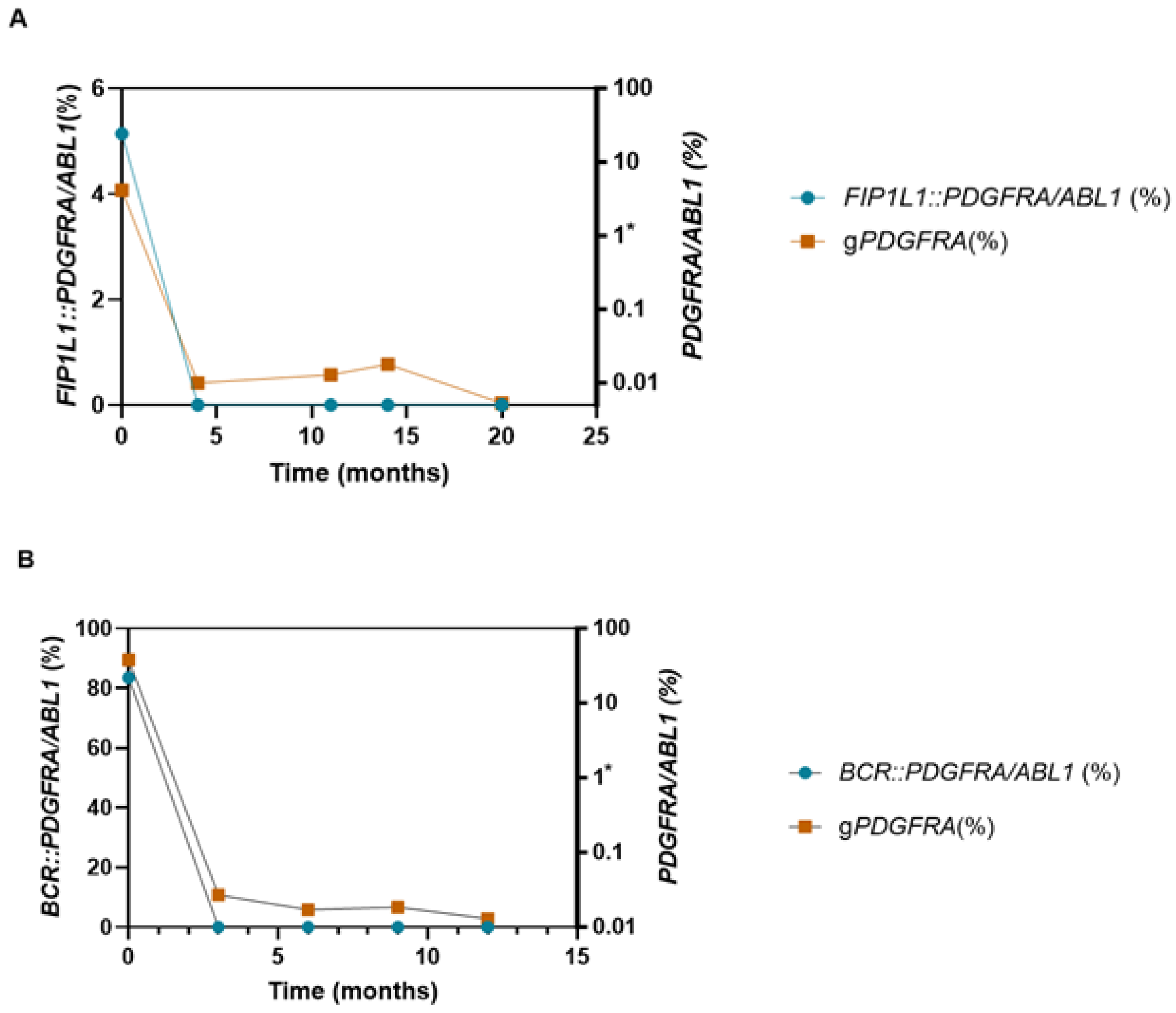 | P9 | M | 27 | MPN | FIP1L1::PDGFRA | 2.53 | 88.13 | 38 | n.t | unsuitable | n.t | n.t | FIP1L1::PDGFRA | Imatinib 100 mg/d | unk |
