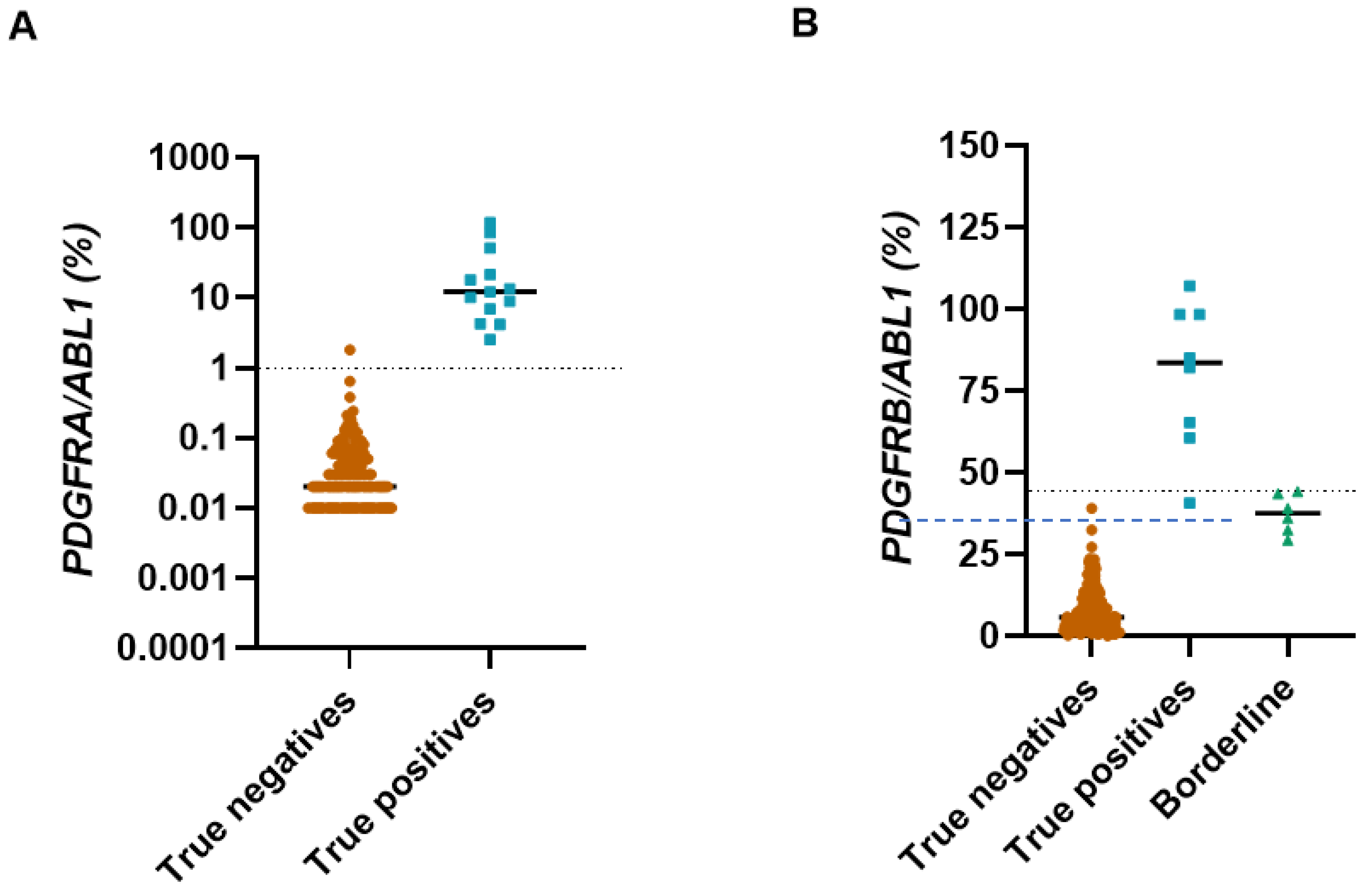 - Erben, P.; Gosenca, D.; Muller, M.C.; Reinhard, J.; Score, J.; Del Valle, F.; Walz, C.; Mix, J.; Metzgeroth, G.; Ernst, T.; et al. Screening for Diverse PDGFRA or PDGFRB Fusion Genes Is Facilitated by Generic Quantitative Reverse Transcriptase Polymerase Chain Reaction Analysis. Haematologica 2010, 95, 738–744. [Google Scholar] [CrossRef] [PubMed]