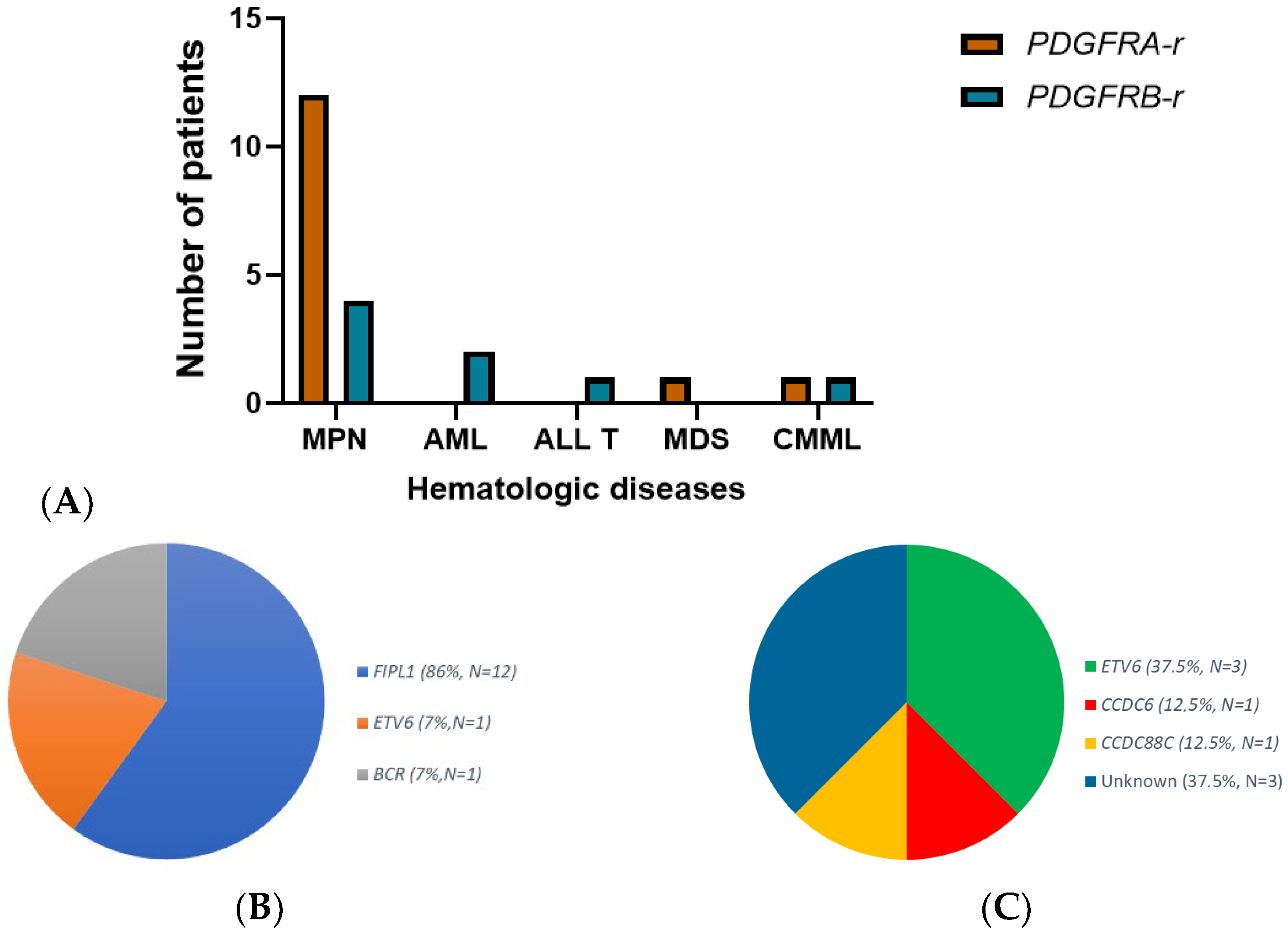 - Rohmer, J.; Couteau-Chardon, A.; Trichereau, J.; Panel, K.; Gesquiere, C.; Ben Abdelali, R.; Bidet, A.; Bladé, J.-S.; Cayuela, J.-M.; Cony-Makhoul, P.; et al. Epidemiology, Clinical Picture and Long-Term Outcomes of FIP1L1-PDGFRA-Positive Myeloid Neoplasm with Eosinophilia: Data from 151 Patients. Am. J. Hematol. 2020, 95, 1314–1323. [Google Scholar] [CrossRef] [PubMed]