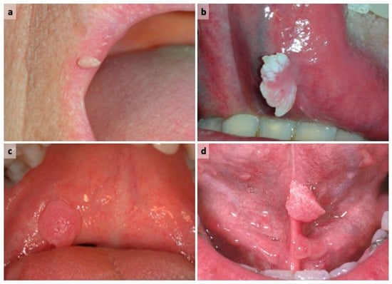 Oral lesions traditionally associated with LR-HPV: (a) wart on upper lips; (b) papilloma on ventral surface of tongue; (c) condyloma on soft palate; (d) condyloma on ventral surface of tongue.
