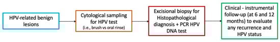 Currently, the diagnosis of an HPV infection makes use of the techniques of nuclear biology, the aim of which is to detect the DNA of the virus inside the cells by means of marked genetic probes. The most sensitive and most appropriate biomolecular method for identifying the HPV genome is the PCR (Polymerase Chain Reaction). Recently, an SPF10-LiPA system has been introduced, which successively enhances the PCR method and genotype identification. It has been found to display elevated sensitivity and specificity, ease of use and the possibility of identifying multiple and persistent infections [11]. Many in the field consider that PCR techniques are preferrable to indirect techniques of viral activity as the latter are responsible for a variable rate of false negatives. Regarding a definitively safe and standardized HPV detection technique, a standard diagnostic protocol relating to the oral cavity has not yet been established in terms of: (a) the sample type under biomolecular investigation (e.g., histological sample vs. exfoliated cells); (b) the cytological sampling method (e.g., brush vs. oral rinse); (c) a procedure for the preservation of the histological sampling (e.g., frozen fresh vs. fixed in formalin and paraffin); and (d) a specific biomolecular technique to be used. The direct consequences of these weaknesses are evident. Irrespective of such weaknesses, a protocol can be used thus: in the presence of a single/multiple exophytic lesion(s) with a slow-growing, warty surface in the absence of local traumatic factors (e.g., mechanical, physical, chemical), the HPV test can be performed on cytological sampling, which must be performed prior to the excision of the oral lesion, or directly onto a paraffin section of the histological sample (according to the criteria of a given microbiological laboratory of referral) (Figure 2). Thereafter, an excisional biopsy of the lesion and confirmation of the histopathological diagnosis will be conducted. Follow-up at 6 and 12 months is advisable in order to ascertain any recurrence [12]. Where an HPV test is positive, follow-up should reoccur at 6–12 months and, where possible, after another 12-month period until the test is negative [12]. Many authors believe that it is indispensable to share this latter clinical protocol with dentists and ENT doctors in order to construct a not dissimilar pathway of the diagnosis and management of these benign lesions, which are typically associated with an LR-HPV infection.