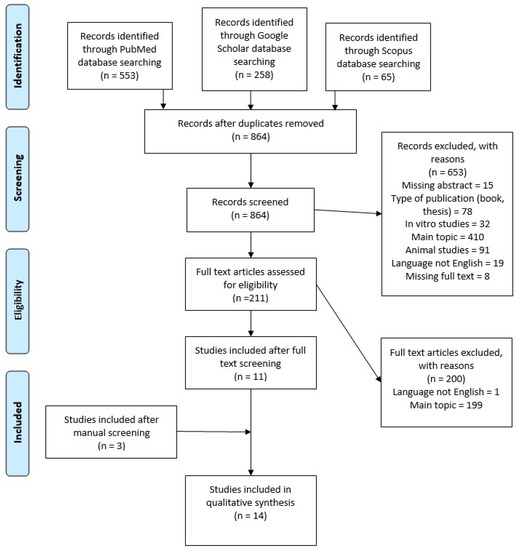 An initial search of PubMed, Google Scholar and Scopus databases identified a total of 876 documents. Twelve records were excluded because they were duplicates. Titles and abstracts of retrieved studies were screened and all the studies that did not meet the inclusion criteria were excluded. Thus, 653 records were excluded after reading titles and abstracts due to type of publication (book or thesis), main topic, in vitro studies, animal studies, language (other than English) and incapability to retrieve the abstract and/or the full text.