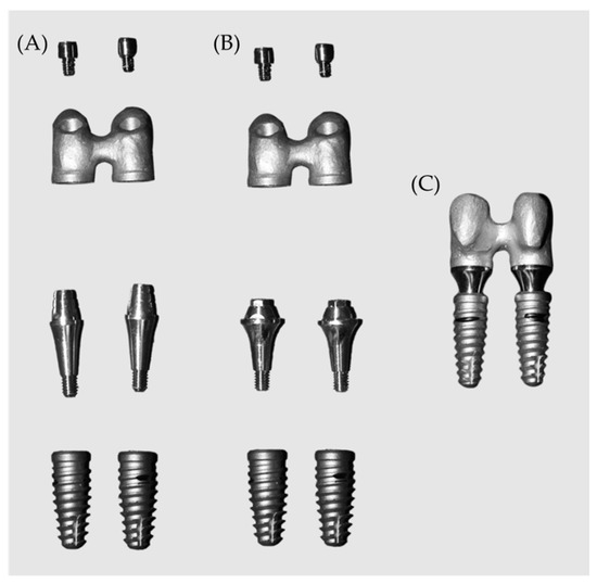 Study design showing the components used in each group. (A) Implant set, straight trunnion, metallic framework, and retaining screw of the ST group; (B) implant set, mini-conical abutment, metallic framework, and group MC retention screw; (C) implant–abutment–prosthesis set.
