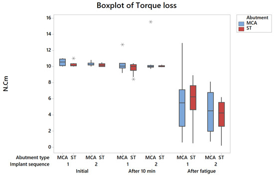 Boxplot of torque measurement according to the implant sequence, abutment type, and tightening moment.