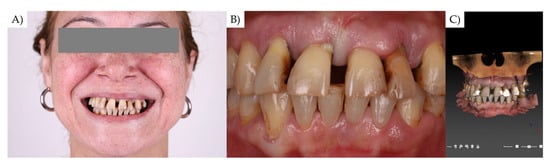 Figure 1. Complete documentation including face (A), smile, intra- (B) and extra-oral photographs, and intraoral scanning (C).