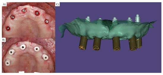 Figure 6. After the implants’ placement (A) the first intraoral scan is performed using scan bodies (B,C).