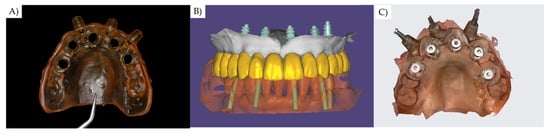 The edentulous arch scan can be difficult, and viable techniques are not commonly described. Similar to previous reports [2,11,12], for the present dental technique, the manufacturing of a surgical guide requires an adequate, complete denture and knowledge of 3D modeling, CAD software, and 3D printer [2,11,12]. The use of a custom scanning device reduces the number of clinical steps, with adequate retention, stability, and support. However, in the present report the custom scanning device is a hybrid device applied in the surgical step for proper implant placement, as well as to improve the scanning process, the transferring of oral tissue characteristics, implants’ position, and the maxillomandibular relationship registration.