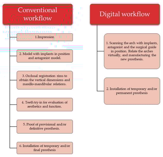 The traditional analogic workflow for implant-supported rehabilitations in an edentulous maxilla requires an existing denture to prosthetically drive the implant placement. Therefore, the presented approach does not use analogic processes as cast models or impression materials, but still need an existing denture for the similar aim of prosthetically driving the implant placement. The summarized workflow for each approach can be observed in the flowchart from Figure 9.