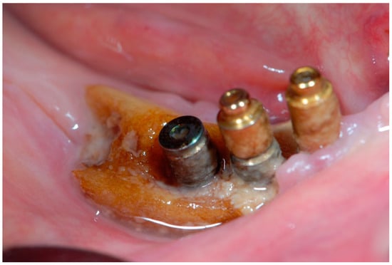 As in many other pathologies, prevention is always the main focus in patients following at-risk MRONJ therapeutic protocols; conservative measures, such as good oral hygiene, 0.12% chlorhexidine mouthwashes, and the treatment of any early dental or periodontal lesions are fundamental. In fact, any surgical intervention should be avoided, though the prevention of this may lead to areas of exposed necrotic bone []. In the past, the onset of the lesions was thought to be related to minor oral surgery in at-risk patients being administered drugs for long periods; on the contrary, recently, periodontal and peri-implant infections have been considered as crucial risk factors, being the sites that often need surgical dental or implant removal, and so leading to the onset of MRONJ lesions [].