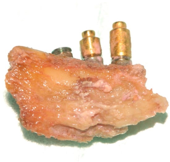 Macroscopic aspect of the detached necrotic bone fragment that includes the implants.