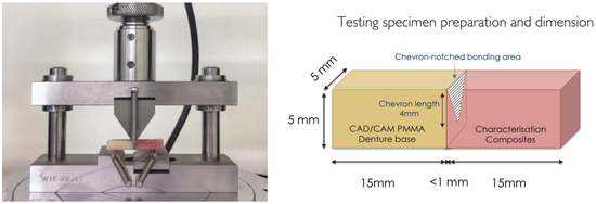 Images showing the chevron-notch three-point bend flexure bond test set up and specimen dimension (Chevron notch dimension is an equilateral triangle with a side of 5 mm).