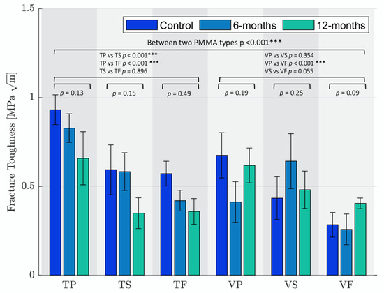Fracture toughness of all sample groups representing control, 6 months and 12 months. The vertical lines represent 95% Confidence Interval ranges for Tukey’s pairwise comparisons. *** indicates a statistical significance level p < 0.001.