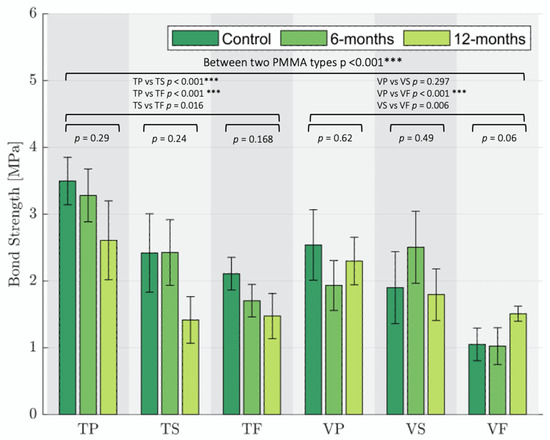 A statistically significant difference was observed in bond strength of the T group with P and S and F (p < 0.001); meanwhile, the bond strengths for S and F showed no statistically significant difference (p = 0.016). For the V group, a statistically significant difference was found for the strength of the bonds with P and S (p < 0.001). No statistically significant difference was observed within subgroups; however, F and S showed a slight increase in bond strength after artificial ageing of 12 months and 6 months.