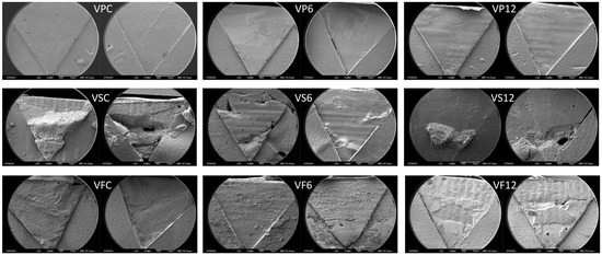 The SEM images of each group are shown in Figure 5 and Figure 6. For the V groups (double cross-linked PMMA), the VP groups showed a predominantly adhesive failure at the PMMAs/composite interface from the control to the 6- and 12-month aging groups. The VS groups showed a cohesive failure within the composite in the control but switched to adhesive failure at the PMMAs/composite interface in the 6- and 12-month aging groups. The VF groups showed a cohesive failure within the composite in the control but switched to adhesive failure at the PMMAs/composite interface in the 6-month aging group and to a mixed mode—adhesive and cohesive—in the 12-month aging group. For the T groups, the P and S groups went from a predominantly adhesive failure at the PMMAs/composite interface to a mixed mode of adhesive and cohesive failure in both the 6- and 12-month aging groups. In the F group, the dominant mode of failure was cohesive within the composite for the control and the 6- and 12-month aging groups.