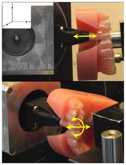 - Bourauel, C.; Drescher, D.; Thier, M. An experimental apparatus for the simulation of three-dimensional movements in orthodontics. J. Biomed. Eng. 1992, 14, 371–378. [Google Scholar] [CrossRef] [PubMed]