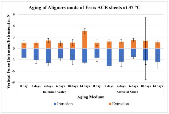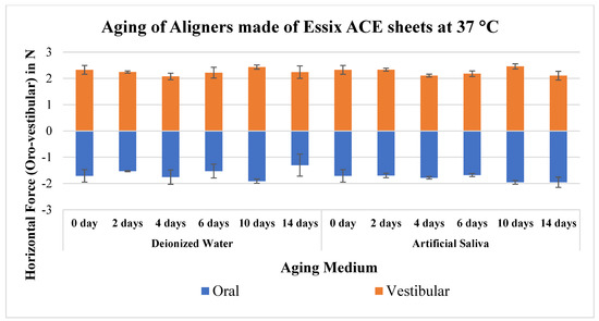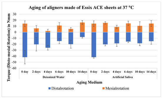 - No significant difference between the forces/torques of the aligners stored in distilled water and those stored in artificial saliva, which means that the effect of the type of used medium for aging of aligners in vitro is insignificant; and