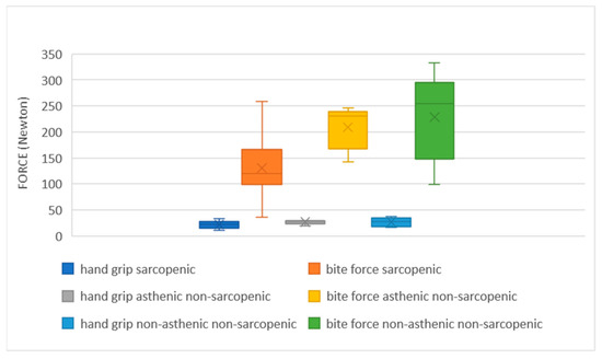 | Hand grip test | 24.2 ± 7.0 (9.2–35.1) | 23.4 ± 6.5 (10.1–34.4) | 27.6 ± 4.9 (19.2–31.9) | 23.1 ± 10.1 (9.2–35.1) | 0.501 |