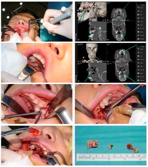 The surgery was performed under general anesthesia with the aid of the surgical navigation system, as previously described. An intra-sulcular palatal incision was made, extending from dental element 1.3 to the right tuber maxillae. We performed an ostectomy to identify the dental element 1.6 in palatal position by using the navigation system pointer. Then, we safely proceeded with the avulsion of the dental element 1.6. On the left side, in order to remove the dental elements 6.5 and 2.6, we performed a vestibular incision extending from dental element 2.3 to the left tuber maxillae and a similar access ostectomy to identify the correct teeth before the avulsion. The intra-operative images are visible in Figure 7.