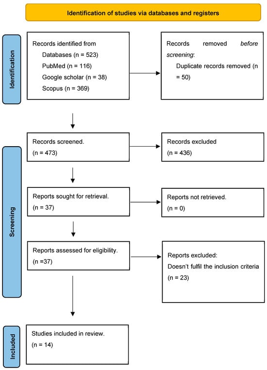 A total of 523 number of articles were found but 50 duplicates were removed, resulting in 473 articles. These articles were then reviewed, with 436 excluded and only 37 sought for retrieval. These 37 articles were again reviewed, and a further 23 were removed as they did not fulfil the inclusion criteria. Ultimately, only 14 articles were considered. Figure 1 shows the Prisma 2020 flow diagram, with a description of the 14 articles according to the 8 categories shown in Table 2.