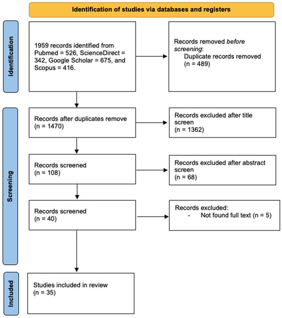 Four databases (PubMed, ScienceDirect, Google Scholar, and Scopus) were searched by two well-trained academician pediatric dentists (B.S. and B.Ç.) using medical subject headings (MeSH terms) and a free hand search up to 31 July 2023. The search terms used were molar incisor hypomineralization, molar incisor hypomineralisation, molar-incisor hypomineralization, molar-incisor hypomineralisation, demarcated opacities, post-eruptive enamel breakdown, MIH, MIH treatment, MIH management, MIH incisors, MIH-affected incisors, and MIH affected incisors. The articles obtained as a result of all of these search strategies were reviewed, and articles relating to permanent first molars were excluded from this study. Only original research articles, case reports, and case series related to the treatment of incisors affected by MIH were included in this study. The eligibility of the articles was determined by reading the title and the abstract and, where necessary, by examining the full text of the articles. As a result, 40 articles were selected for review. The full texts of five of these articles could not be accessed. A total of 35 articles were examined in detail by both examiners and included in this review (Figure 1: Flowchart of study selection according to PRISMA statement). The 35 articles included in this study are shown in Table 1.