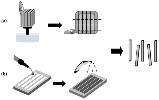 Resin composite blocks were sectioned using a precision cutting machine with a diamond disk with 0.3 mm thickness (Accutom 5, Struers, Ballerup, Denmark) with a feed speed of 0.050 mm/s, at 1000 rpm, under permanent water refrigeration. The blocks were firstly sectioned with a parallel cut to their long axis and then rotated 90° to be sectioned perpendicularly (Figure 1a). Therefore, sticks with nominal sizes of 2.1 × 4.2 × 16 mm (depth × width × height) were obtained, as recommended according to ISO 6872:2023 [17]. The outer sticks of each block were discarded, as well as those presenting visible chipping, since these flaws could significantly influence the test results.