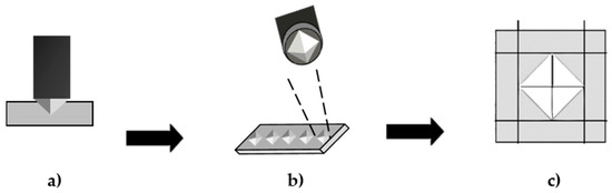 The schematic presentation of Vickers microhardness determination. (a) Indentation made using a Vickers indenter (transversal view); (b) five indentations per sample; (c) measurement of the indentation size (top view).