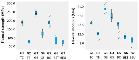 Boxplots of flexural strength and flexural modulus results. Outliers and extreme outliers are represented with dots (o) and asterisks (*), respectively.