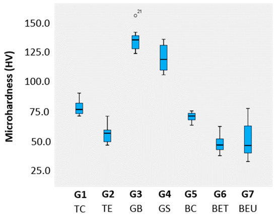 Boxplots of the Vickers microhardness results. Outliers that are represented with dots (o).