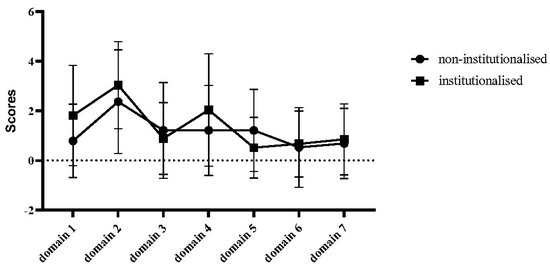 A total of 49 elderly people were recruited in this study, with 22 participants from the community centre and 27 participants from a residential nursing home. The mean age of the participants was 74.0 ± 10.9 years old. Males consisted of the majority of recruited people (67.3%). Table 1 presents the demographic information, oral health-related behaviours, and the OHRQoL between non-institutionalised and institutionalised groups. There is no significant difference between the two groups regarding sex, age, education level, and monthly income. Less than half of the participants had a history of smoking, and more than 70% of the elderly people consumed tea daily. Only a few elderly people had visited a dentist within one year; the prevalence was slightly higher in institutionalised people, and there was no significant difference between the two groups (9.1% for the non-institutionalised group and 18.5% for the institutionalised group, p = 0.436). The prevalence of regulated toothbrushing habits was higher in the institutionalised elderly people, but there was no significant difference between the groups. The OHIP-14 score was 8.0 ± 8.3 for institutionalised elderly individuals and 9.7 ± 9.6 for non-institutionalised individuals (p = 0.534). The responses of seven OHIP-14 domains are presented in Figure 1. There was no significant difference in the scores of all OHIP-14 domains between study groups. Domain 2, namely, physical pain, showed slightly higher scores (2.37 ± 2.09 in non-institutionalised elderly people and 3.04 ± 1.75 in institutionalised people), but there was no statistical significance. For the elderly people living in institutions, the three most affected OHIP-14 domains were ‘physical pain’, ‘physical disability’, and ‘functional limitation’. Meanwhile, ‘physical pain’, ‘psychological discomfort’, and ‘physical disability’ were the most influential domains for elderly people living in the community.