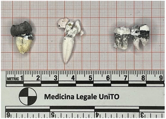 In modern society, the role of forensic sciences in the identification of human remains is a necessary condition for social and legal reasons. The most effective methods of identification are based on the collection and comparison of primary identifiers, through the analysis of DNA, fingerprints, skeleton, and teeth, especially when unidentified human remains are severely decomposed, skeletonized, or burnt. Dental data and dentition of an individual can provide even clearer information regarding the victim’s identity, specifically in burnt human remains. Teeth are one of the most resistant tissues in the human body, less prone to modifications caused by postmortem phenomena and potential insults to which a body may be subjected, both antemortem and postmortem. Their structural uniqueness, combined with the presence of restorative materials, implants, or orthodontic appliances, makes their study crucial in the identification of victims in disasters, accidents, or crimes where bodies have been exposed to extreme conditions []. Fire represents one of the most destructive traumas that can affect the human body, as it damages and alters crucial evidence for the reconstruction of the victim’s identity [,,,]. There are numerous variables that influence the effects of this process and can affect the degree of body compromise. Combustion can be partial or total, complete or incomplete. From a biochemical perspective, the exposure of a body to heat, whether postmortem or antemortem, causes massive dehydration of organic components, leading to the destruction of soft tissues and the gradual exposure of the skeleton until complete combustion occurs []. The study of incinerated human remains poses challenges due to the destruction of most body structures except for skeletal and dental tissues and for this reason dental remains are crucial for forensic reconstructions, as the unique structure and organization within the oral cavity provide valuable information for victim identification []. Forensic odontologists should work at the scene to prevent loss of dental evidence and preserve fragile remains. Photographic and radiographic cataloging allows for comparison with research data correlating morphological alterations with temperature ranges. Teeth behave similarly to bone under heat, with enamel having little organic material and dentin and cementum undergoing modifications based on position and organic content [,]. The duration of combustion is also a crucial parameter in determining the tissue’s destruction []. Enamel has virtually no organic material (although it is the outermost tissue), while dentin and cementum undergo modifications based on their position and the amount of organic content present. Taking into account the histological and anatomical characteristics and adhering to the protocols for sample collection [], forensic odontologists can analyze changes in color, alterations in dimension, and any fracture patterns that have occurred in the teeth after exposure to heat, referring to the relevant literature evidence for further analysis [,].