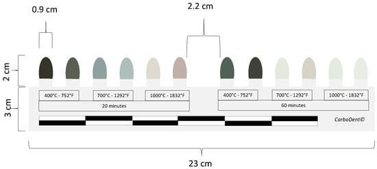 The structural, dimensional, and colorimetric changes in burnt human remains described in the literature [,,,] do not currently provide a reference associated with a reproducible color code. Therefore, the proposed new colorimetric scale for burnt human teeth (”carbodent”) will allow for visual assessment and interpretation using suitable color detection and analysis tools during the dental autopsy observation. It must be highlighted that teeth heated in different environments, such as in an oven, kiln, or open environment, as well as cooling aspect of the process, can exhibit varying types of discoloration []. Therefore, the proposed device is not intended to indicate a specific color after heating, but rather to facilitate the differentiation between ranges of heated teeth up to 400 °C or over 700 °C. Due to the potential variations in discoloration resulting from different heating conditions, a flexible interpretation of the data is always necessary.