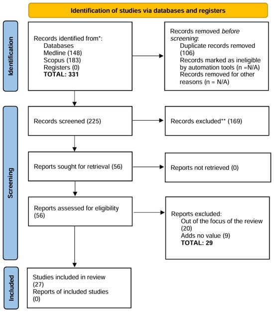 This scoping review was performed following the 2020 PRISMA (Preferred Reporting Items for Systematic Reviews and Meta-Analyses) guidelines for the Scoping Reviews Checklist []. This review was registered with the OSF Registries (registration DOI: https://doi.org/10.17605/OSF.IO/U2B8D, accessed on 12 August 2024).