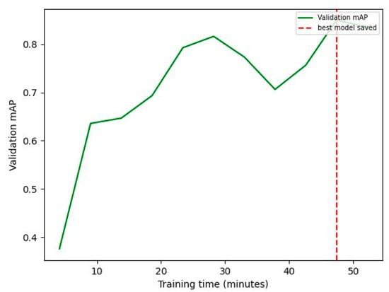 The total training time amounted to 60 min and 27 s. For each of the five classes, an 80% random subset (179 photos) served as the training set, while the remaining 20% (42 photos) constituted the validation set. During fine-tuning, a flat learning rate of 10 × 10−3 and a large model size were employed throughout training, ensuring stable convergence while updating the network parameters. The Stochastic Gradient Descent (SGD) optimizer with momentum was utilized for efficient optimization, facilitating rapid convergence towards a locally optimal solution. Additionally, a batch size of one image was used, allowing for dynamic adjustments during training to accommodate variations in image characteristics and lesion manifestations. The selection of the model checkpoint was based on the highest mean average precision (mAP) metric achieved on the validation set, which occurred at 47 min and 22 s (Figure 1). The cross-entropy loss function was used. Regarding the hardware used for training, the SentiSight.AI web-based tool was utilized. It is important to note that the hardware choice does not influence the accuracy of predictions and, therefore, is not relevant to the scientific study. The focus lies on the methodology, algorithms, and data quality rather than the specific hardware configuration. The best model occurred at 47 min and 22 s.