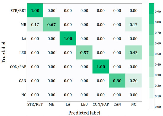 Normalized confusion matrix for multiclass performance. The values on the diagonal represent the TP, indicating the proportion of correct classifications for each class. The proportions of misclassifications for each class are shown in the far-right column, labeled as “NC”, which represents FN. These are cases where the model failed to classify an image into any of the specified classes. The other cells outside the diagonal represent FP, where the model incorrectly classified an image as belonging to a particular class when it did not. Abbreviations: STR/RET, striate-reticular lesions; MB, morsicatio buccarum; LA, linea alba; LEU, leukoplakia; CON/PAP, condyloma–papilloma; CAN, oral candidiasis; NC, not classified.