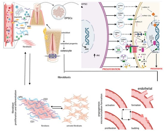 Figure 3 illustrates the complex interaction between dental pulp stem cells (DPSCs), fibroblasts, and endothelial cells in promoting tissue regeneration and angiogenesis during orthodontic treatments. The integration of DPSCs into the bone remodeling process leads to the differentiation of osteoblast progenitors and osteocytes. Fibroblasts, under the influence of extracellular matrix components (e.g., CG1, CG3), proliferate and differentiate to repair tissues. Angiogenesis is facilitated by the activation and budding of endothelial cells, forming microvascular networks that enhance the healing process. The figure also emphasizes the role of microRNAs and signaling pathways, such as Akt and STAT3, in regulating cellular proliferation and differentiation, critical for tissue regeneration under orthodontic forces [19].