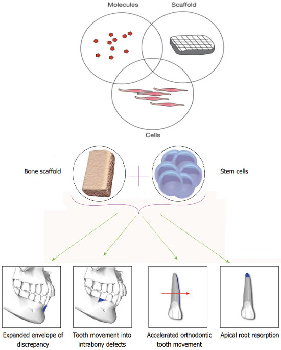The principle of tissue engineering is built around three fundamental components: cells, signaling molecules, and biomaterials and possible applications of stem cells (alone or in conjugation with bone scaffolds) in orthodontics. Adapted from [20,21].