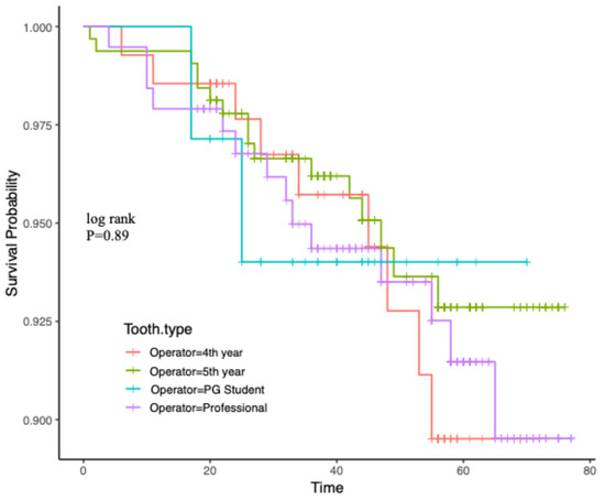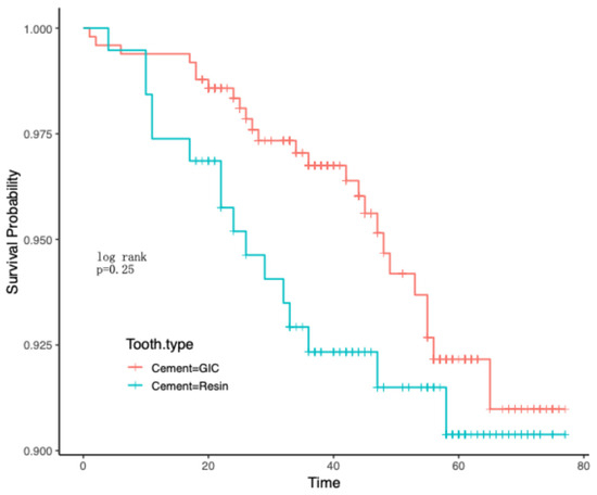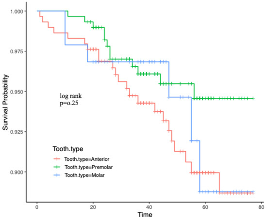All investigated parameters in this study showed no significant influence (p > 0.05) on the survival of teeth treated with a dental post. This is illustrated in the Kaplan–Meier survival curves (Figure 2, Figure 3, Figure 4, Figure 5, Figure 6, Figure 7 and Figure 8) and the Cox regression analysis (Table 4).