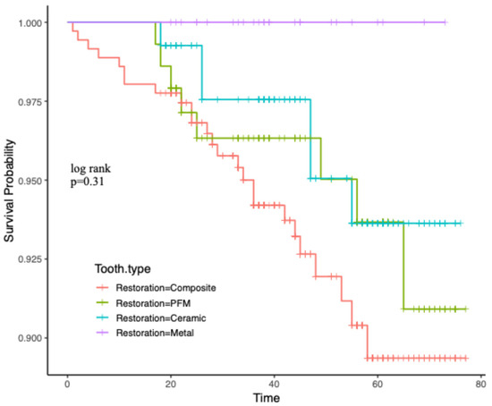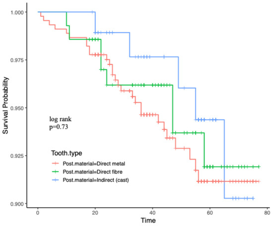 In the present retrospective study, no statistically significant difference in survival was found between different post materials. This was the same finding from Martino et al.’s retrospective study [12]. However, in Vogler et al.’s retrospective study, they found a higher survival rate in teeth treated with direct fiber posts [34]. Other existing reviews have failed to associate survival rates with a particular post material [30,31,38,39,46,47].