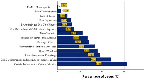 Figure 1 depicts the challenges associated with the provision of oral hygiene care practices among the participants. Among the 201 participants, the majority of them (62.18%, n = 97) stated that their patients’ behaviors and physical disabilities were major challenges to providing quality oral hygiene care. However, only 28.21% of the participants reported that a shortage of healthcare professionals was a barrier. (Figure 1)
