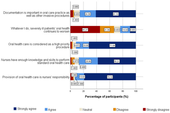 Among the 201 participants, 45.27% strongly disagreed with the statement “whatever I do, severely ill patients’ oral health continues to worsen” while only 8.95% of the participants agreed with that statement. In addition, 9.45% of the participants were neutral because they lacked a strong opinion on the statement. According to the statement that “nurses have enough knowledge and skills to perform standard oral hygiene care”, 1.5% of participants disagreed, and 58.21% of participants strongly agreed that they had enough knowledge and skills regarding oral hygiene care practices (Figure 3).
