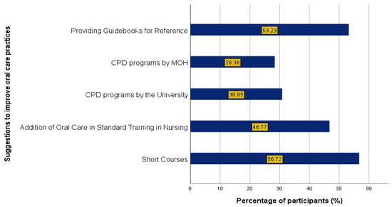 The majority of the participants (56.72%) suggested participating in short courses with up-to-date knowledge of oral hygiene care and current practices. While 30.85% of participants suggested conducting continuing professional development (CPD) programs by the university, 28.36% of participants suggested conducting CPD programs by the Ministry of Health (MoH) (Figure 4).