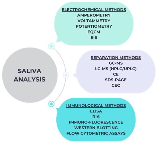 Biomarkers and metabolites can be extracted from saliva using a variety of approaches, such as immunological methods, separation methods, and, more recently, electrochemical methods [70], as can be seen in Figure 2: