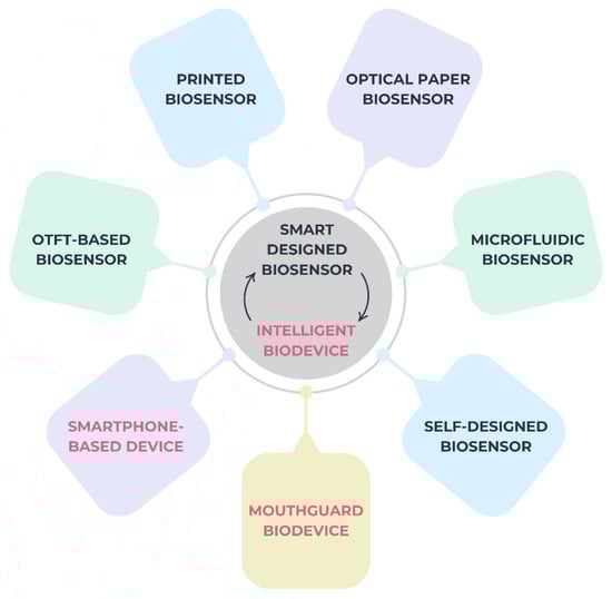 An increase in operational efficiency and practicality necessitates biosensors that are more integrated and useful. Utilizing printing technology, microfluidics, organic thin film transistors (OTFTs), paper-based sensing, etc., which are more suitable with smart and flexible devices, is performed with the aim of enhancing the intelligent process of sensors [112,113,114]. Using these technologies, biosensors for salivary detection may be equipped with sophisticated features, including auto calibration, wireless connectivity, and a microprocessor, in addition to being able to be integrated with other devices [113].